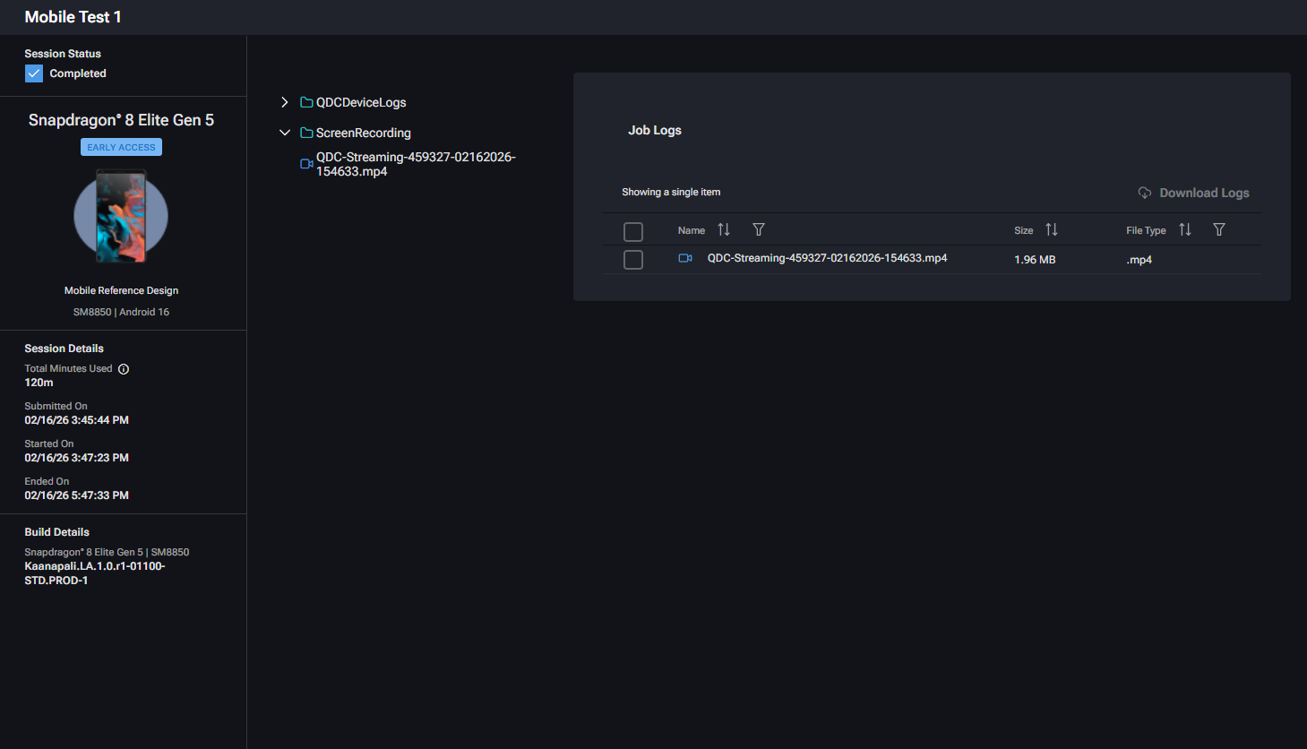 - Session details such as session duration, start/stop timestamps, application used, and test type